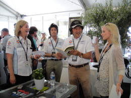 | 美しい美女達に囲まれて笑顔を見せるアストンマーティンのおじさん レース前日のレセプションにて |