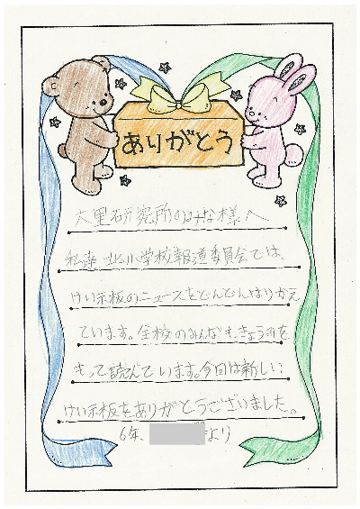 そして、5月25日、張替えを行う報道委員会の児童が、大里研究所を訪れ、お礼の手紙をくれました。
