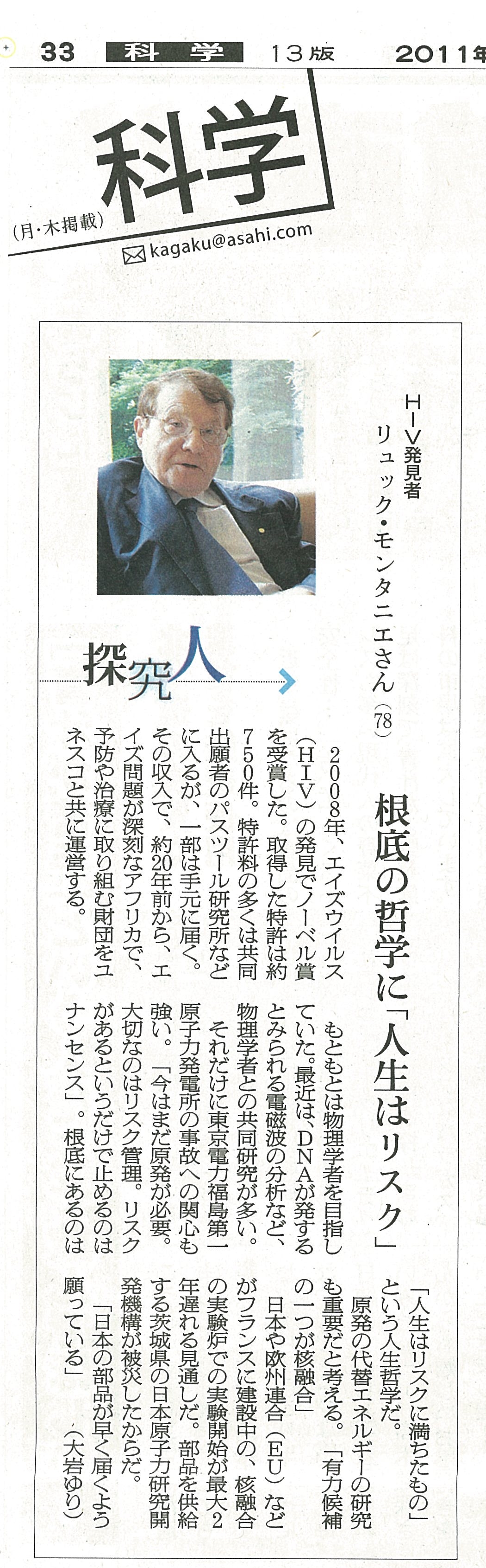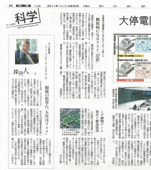 6月30日朝日新聞にモンタニエ博士のインタビュー記事が掲載されました。モンタニエ博士の哲学がまとめられています。